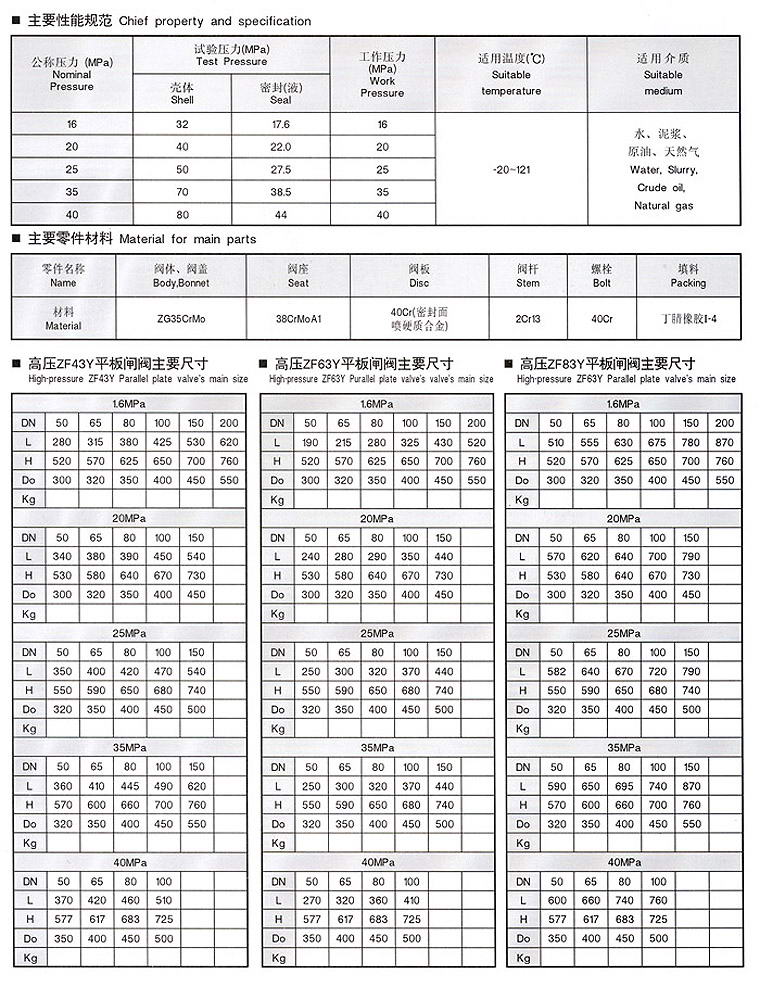 | 高壓平板閘閥參數: |